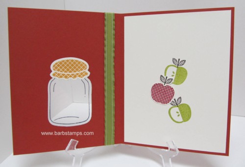 Put a small bit of SNAIL on the DSP to hold it in place while you run it through the Big Shot with the Cannery Framelits Dies. Attach your Very Vanilla layer to the inside of the card and stamp your apples through the jar hole.