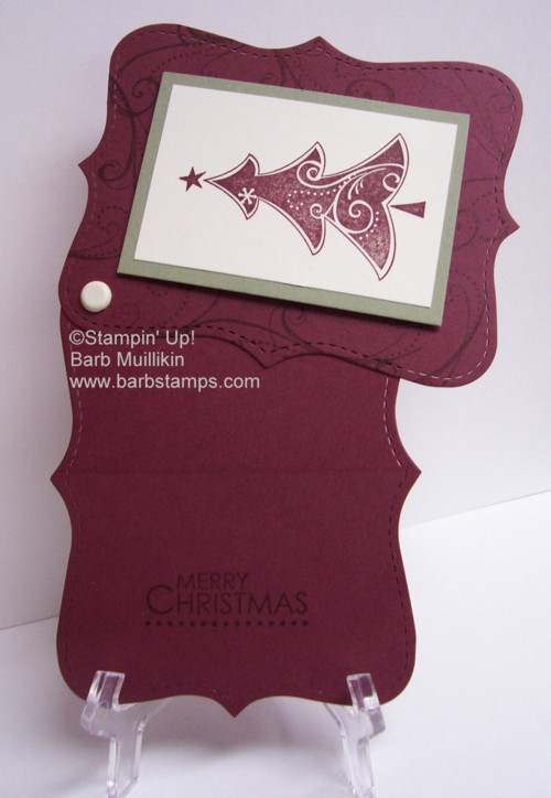 This tag can double as a Gift Card Holder. We used the Season of Joy stamp set and Bravo Burgundy, Mellow Moss and Very Vanilla cardstocks. The 5/16 Brad in the corner makes the top swivel out to reveal the pocket inside. The main shape is made by running card stock through the Big Shot with the Top Note die.