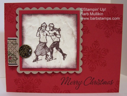 This card was so easy to make and may just be the one I make this year. I used the Winter Post stamp set and added a folded strip of fabric from our Deck the Halls Designer Fabric Pack (121716) around my 1 1/4" Early Espresso Striped Grosgrain.