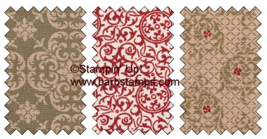 Fabric accents are all the rage lately and I thought I would try my hand at a couple. Stampin' Up! has two different packs of fabric in the Holiday Mini Catalog. They are priced at $9.95 each and you get three extra large fat quarters in each pack. Each piece of fabric measures 18" x 28" so you have plenty to play with.