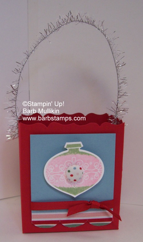 Here is another project with fabric accents. I ran the Candy Cane Christmas fabric (121715) through the Big Shot Machine with the Multipurpose Adhesive Sheets and the Tasteful Trim die to create the scalloped border on along the bottom of the Fancy Favor Box. I found an old button covering kit while cleaning a while back so I decided to play with it. I covered a few buttons with fabric and ribbon and added this little cutie to the center of my focal point. The Silver Tinsel makes the perfect handle and is also in the Holiday Mini Catalog.