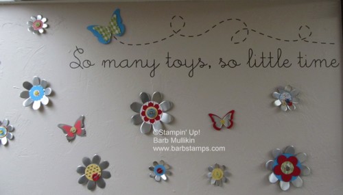 Pawsitivelyprints I used the Pawsitively Prints II Designer Series Paper to decorate them along with various embellishments I had on hand.  The So Many Toys Decor Elements phrase comes with a paper airplane image at the end but LeeAnn discarded the airplane and replaced it with the butterfly….BRILLIANT!!!!!  I love looking at this in my stamp room, it is just so fun. :-)  Order your Flower Folds Die and So many Toys Decor Elements HERE