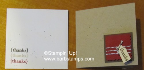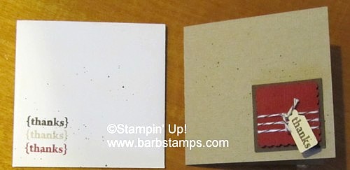 BARB'S TIP: Wrap your Cherry Cobbler Baker's Twine around the edges of the Postage Stamp Punchout to create some nifty patterns. The punchout has notches along the edges making it easy peasy to wrap the twine evenly. The Baker's Twine also comes in White and Early Espresso.