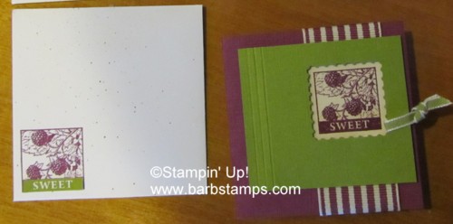 This set uses Old Olive and Rich Razzleberry. The 1 1/4" Striped Grosgrain Ribbon works perfectly as a wrap for this card. It adds very little bulk and really makes the Old Olive layer pop.