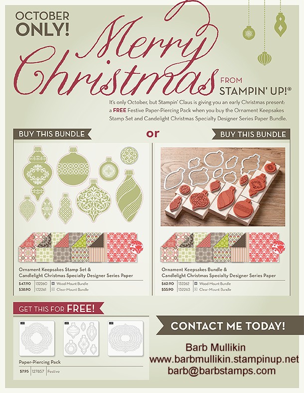During October, purchase the Ornament Keepsakes stamp set or bundle with the Candlelight Christmas Specialty Designer Series Paper and get the Festive Paper Piercing Pack FREE!!