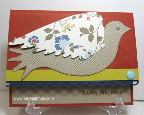 My card project uses the Elegant Bird Bigz Die along with a couple of the patterns from the Comfort Cafe DSP Pack. My color combination came from this paper. I find that Designer Series Paper is much like a Color Coach. 🙂