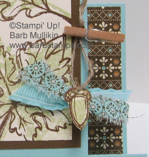 We tied the Pool Party Ruffled Ribbon and a piece of the Spice Cake Fabric together and attached the cut out acorn to the knot with a glue dot. Added a bit of Linen thread and attached the little embellishment to the card with a Mini Clothespin. The Mini clothespins are only $2.95 for a pack of 24, what a bargain!!