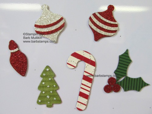 For the Glimmer Ornament Magnets, I used my Extra Large Oval #119859 to punch out some skinny strips to add the stripes to make them even more glittery!! For the Holly Berry and leaves, I stamped my Garden Green card stock with the Stripes ala carte stamp before attaching it to the magnet sheet.