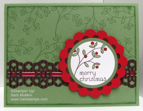 I stamped a piece of Chocolate Chip with the Stripes Mini Background Stamp and punched it with the Lace Ribbon Border Punch 122362. The 1/8" Real Red Taffeta Ribbon was then weaved through the holes. I sponged my layer with Wild Wasabi and mounted it onto my card base of the same color.