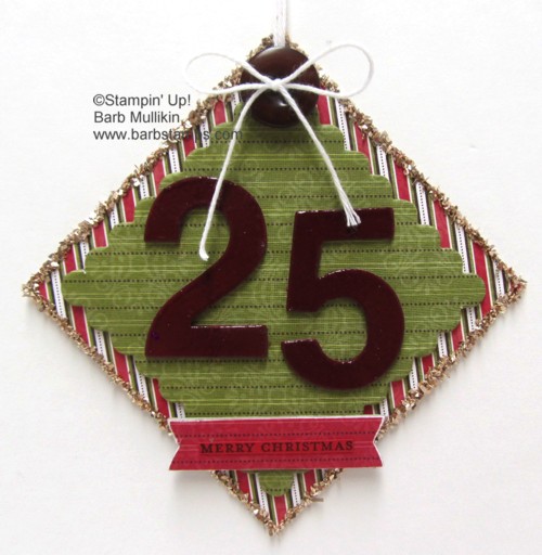 I used Craft Ink on the Merry Medley chipboard pieces, the numbers were sponged with Cherry Cobbler Craft Ink, covered with Clear Embossing Powder and Heat Embossed. The scallop pennant piece of the tree was covered with Chocolate Chip Craft Ink and heat set without the embossing powder. You get different looks with the same ink.