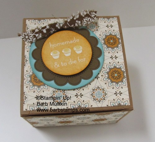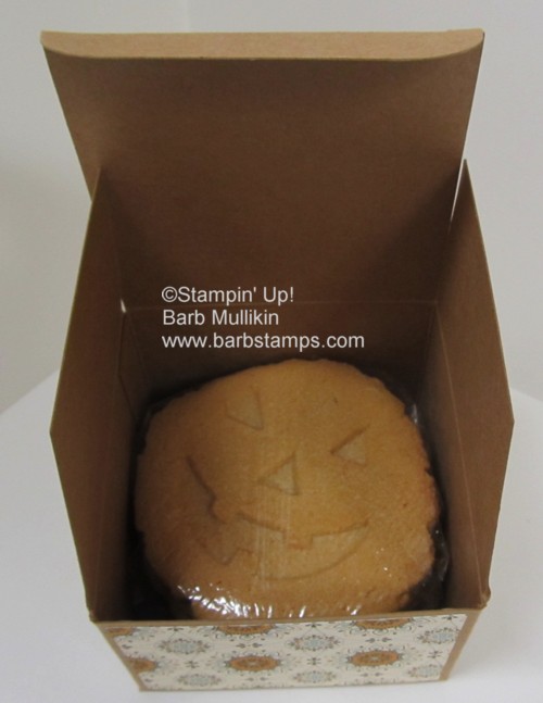 The Kraft Gift Boxes are so great for a little gift. I made My Peanut Butter Cookies – get the recipe HERE – with my Sweet pressed Cookie Stamps and packaged them in one of these boxes as a hostess gift for a recent hostess. I used the Spice Cake Designer Series Paper and cut the side panels to 2 1/4 x 3 1/4, and the top to 3 1/4 x 3 1/4.