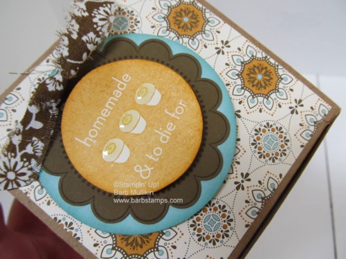 The accent piece was done with the Homemade Stamp and some punches. I added a bit of Crystal Effects to the muffins for some dimension. The Ribbon Knot is a strip of our Spice Cake Fabric.