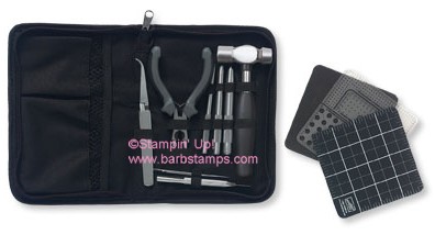We stamped the Really Rust flowers on the diagonal and the splatter stamp from Itty Bitty Backgrounds in Close to Cocoa. We then used the Eyelet Setting Tools in the Crafter's Tool Kit to get holes in the middle of the flowers. These tools are great to get to those spots in the middle of your projects where you want holes. You get a large hole punch and a small hole punch along with the eyelet setting mat and the hammer. This kit has everything and I have a couple of them for sale, use the paypal link to get yours!!!