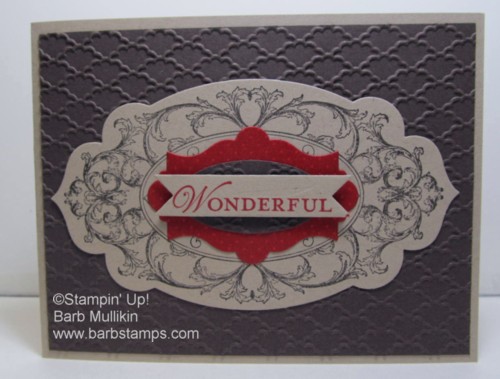 I stamped the largest image in Early Espresso onto Crumb Cake card stock and die cut it with the Apothecary Accents Framelits. I added the Real Red piece which is another framelit from that set, a large oval punch out and finally the word "wonderful" from Loving Thoughts cut with one of the new Bitty Banners Framelits. The neutral colors on the card make the Real Red pop.