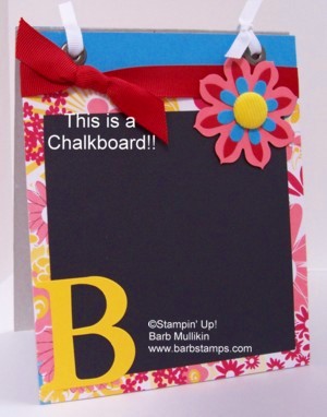 There are so many things you can do with Stampin' Up! products, in addition to making cards, and tonight we will do just that!!! I am having my Fun Stuff Stamp Camp tonight and we will be making a Personalized Notepad in a Tin, click HERE to see it, this fun Chalkboard and a Fleece Flower Pin. The gals will get to choose their Designer Series Papers from my stash and I have alot to choose from!!! This Decorative Chalkboard measures 5 3/4 x 6 7/8. Couldn't you just see this sitting on your kitchen counter. 🙂