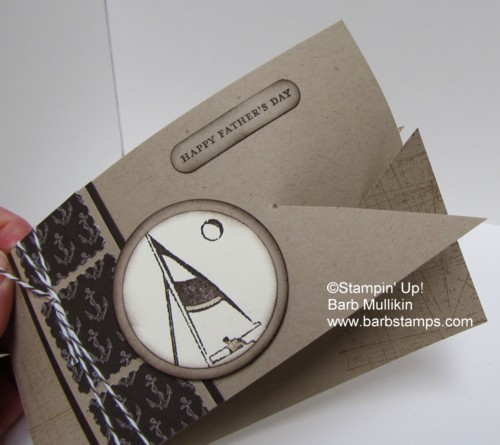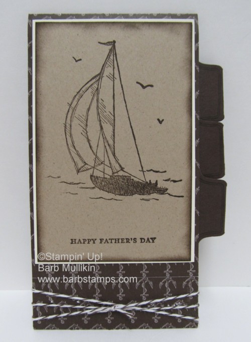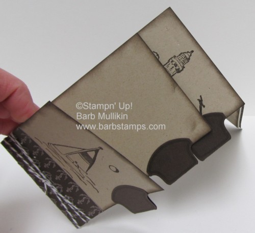 Sailawayminiflipbookout I used the Sail Away Single Stamp from the Summer Mini Catalog on the front and the Uncharted Territory set on the two inside pages.  The Nautical Expedition DSP is cut to 3 x 11 3/4, scored at 5 and 10 3/4 and the pages are 3 x 3 1/2, 3 x 4 1/2, and 3 x 5 1/2.  The Round Tab Punch and the Perfect Punches stamp set were used on the tabs and I wrapped the Early Espresso Baker's Twine around  the bottom to hide the staple.