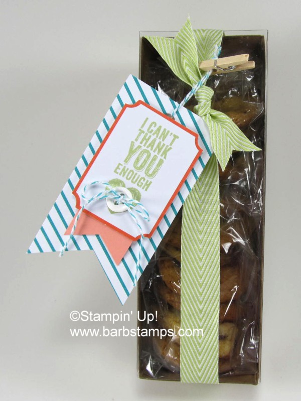 The packaged cookies were placed in the box and slipped into the acetate sleeve. I wrapped my gift with some of our trendy NEW Chevron Ribbon in Pear Pizzazz. The tags and Bermuda Bay Baker's Twine are included in the bundle and I added a snippet of Crisp Cantaloupe card stock cut into a pennant shape.