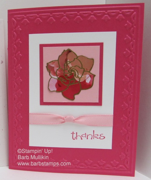 At my Technique Geeks Class this past Saturday, we used a current and a retired Stampin' Up! Catalog. I don't subscribe to magazines so I didn't have any laying around to use for this technique. We also used the So Happy For You stamp set from the Sale-a-bration Brochure along with the new Framed Tulip Textured Impressions Embossing Folder.