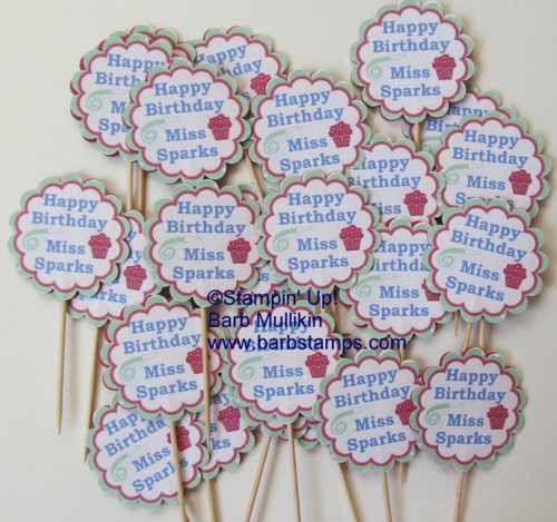 So here they are, 24 homemade cupcakes with custom made Happy Birthday picks. I created the pick art with My Digital Studio. I started by choosing a 1 3/4" Scallop Circle, added a mat, text, a couple of digital stamp images and another scallop to the back and made it just a tad bigger.