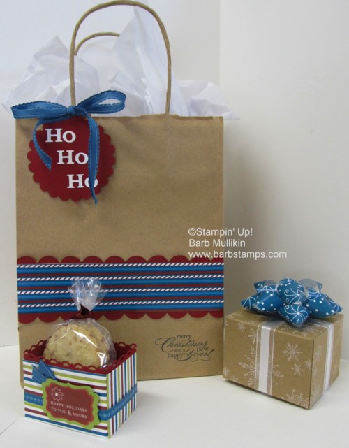 This is my group of goodies. It includes a decorated gift bag, a small box of cookies and a decorated gift box with paper bow.