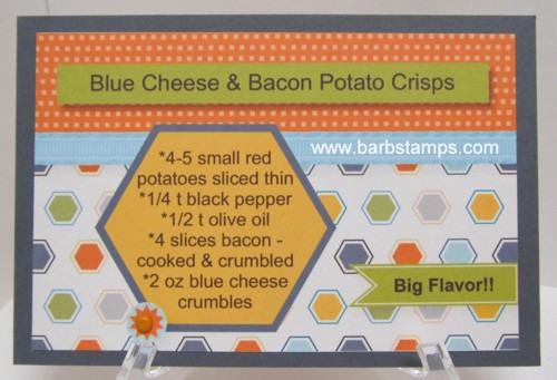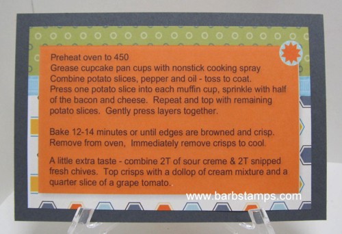 I participate in a recipe exchange each month with some of my customers/friends and this was the recipe I shared in September. I did add a Regals Brad in More Mustard to the sunburst near the bottom for a bit of dimension. Here is a shot of the back of the recipe card: