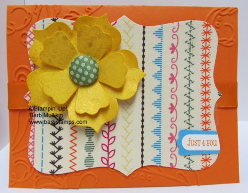I used the Sweet Stitches fabric 121818 with the Top Note die and added a Sweet Stitches Fabric Covered Button 121880 to the middle of the Fun Flowers.