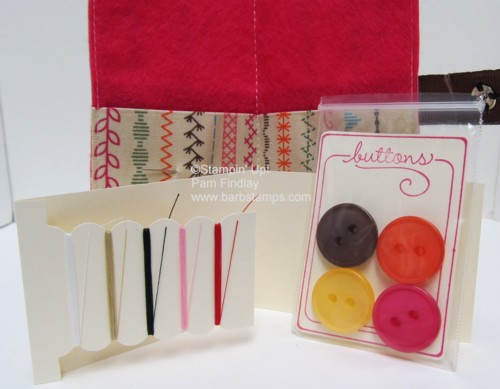 How stinkin' cute is this!! It was made by Pam Findlay for our Control Freaks Occasions Mini Catalog Swap. I about fell over when I saw this. :-) Pam thought of everything. She has a little bag of buttons AND a thread packet that she created with the Scallop Edge Punch.