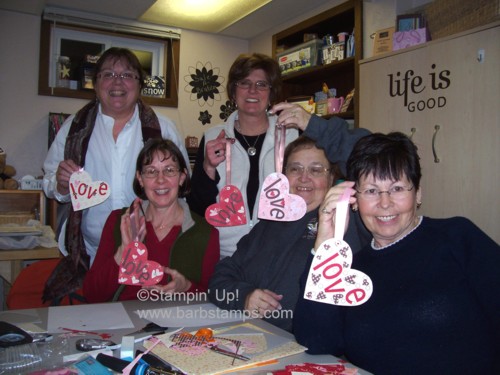 I gave each of the gals a chipboard heart, piece of the Sending Love Glittery Designer Series Paper, strip of the NEW Satin RibbonEpoxy Brad and letters cut with the Simple Letters Alphabet and the Big Shot