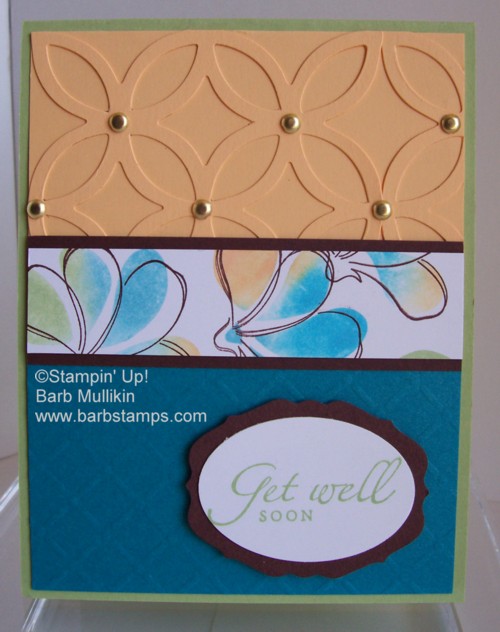 Here is the another card from the group shot I showed you in THIS POST.  I used the OLD Color Coach (105796) to choose my colors for this card and added the Chocolate Chip.  The Colors are Taken with Teal, Apricot Appeal and Certainly Celery.  Boo Hoo, Taken with Teal and Apricot Appeal will be retiring in June so be sure to order your card stock, ink refills and markers before they are gone.