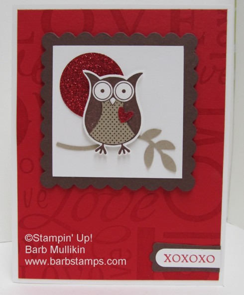 The moon behind him is a 1 1/4" circle punched out of Red Glimmer Paper 121790 and the Crumb Cake branch is from the Two Step Bird Punch 117191.