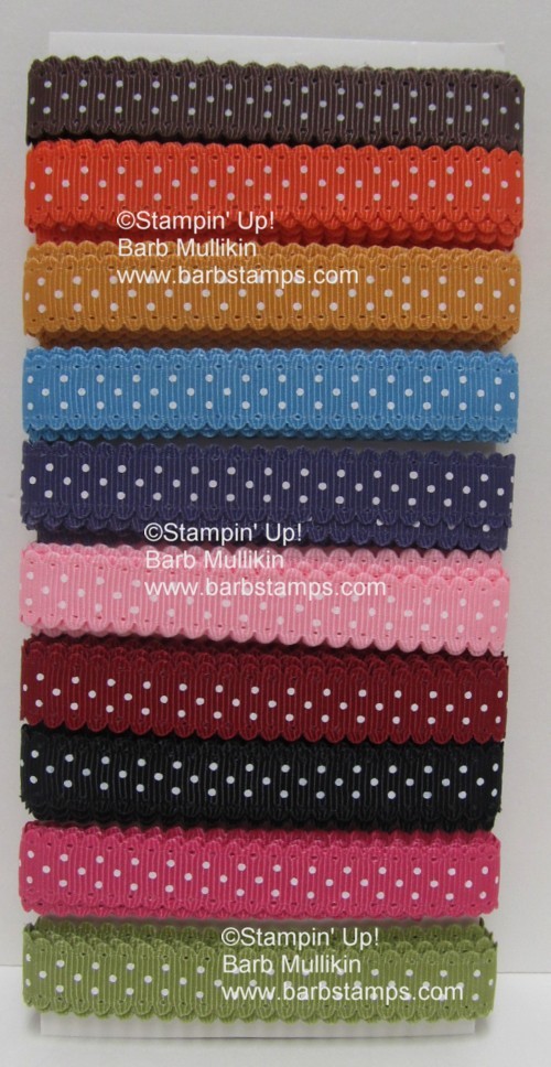 This share includes 2 yards of each of the 1/2" Scallop Dots Ribbon in these colors – Basic Black, Cherry Cobbler, Chocolate Chip, Elegant Eggplant, Marina Mist, Melon Mambo, More Mustard, Old Olive, Pretty in Pink and Tangerine Tango