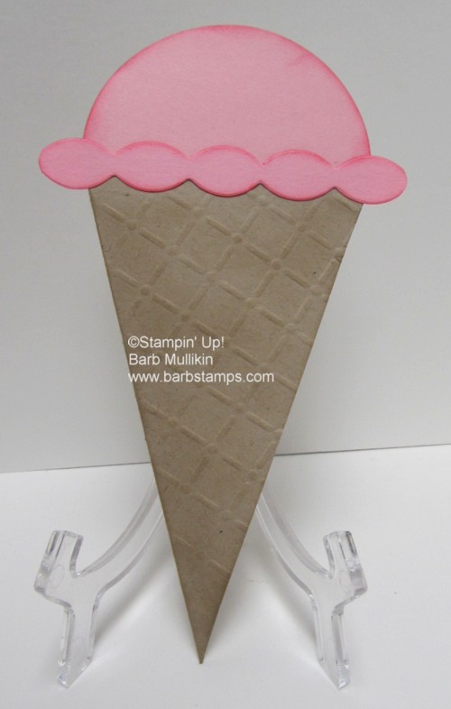 The scoop of Ice Cream is another "petal" off the die that I cut from Pretty in Pink card stock and sponged with Regal Rose ink.  The ripple on the ice cream scoop is from the Tasteful Trim Bigz XL Die 120903 Die that is still available for purchase.