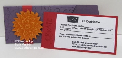 The gift certificate is printed on Whisper White from my computer and I extended the backing on it to fit in the pocket and stamped the word CREATE from the same set at the end. I thought that was a fitting word for a Stampin' Up! Gift Certificate. 🙂