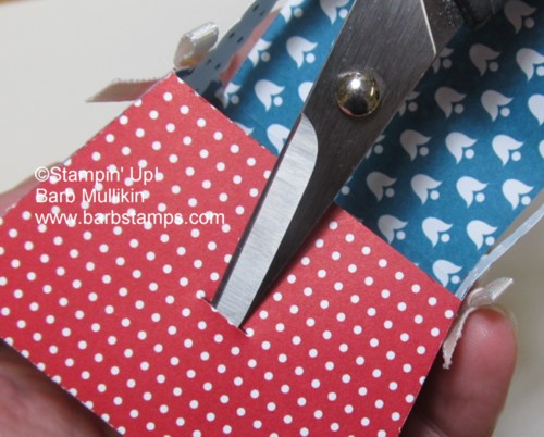 The red polka dot purse is made from one of the patterns included in the Summer Smooches Designer Series Paper. I cut a piece to 8 x 5 1/2 and ran it through the Big Shot with the Petite Purse die. I folded on all score lines, added adhesive on the two small side flaps and assembled it in minutes. I put adhesive on the ends of the handle and added them to the purse. The purse flap simply wraps over the top and is secured into the front of the purse via a small slit that is added when you run it through the die. Here are a couple of shots of how I prepare the slit and of the little flap