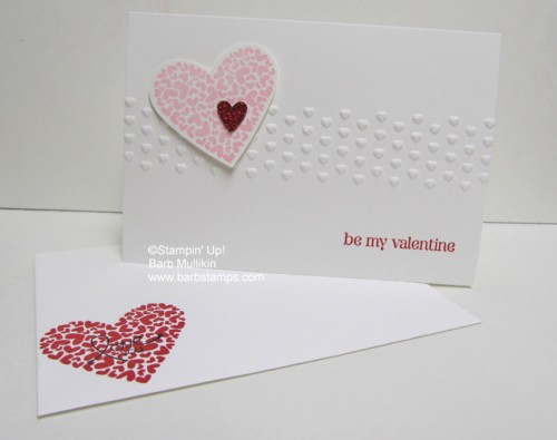 We started with a notecard and ran it through the Big Shot with the hearts folder from the NEW Adorning Accents Textured Impressions Embossing Folders. We then took the heart image from the NEW P.S. I Love You stamp set, inked it with Pretty in Pink, punched it out with the Full Heart Punch and added it to the card with a couple of Stampin' Dimensionals. The greeting is stamped in Real Red and the heart is stamped again on the outside of the envelope and the Love image is added in Basic Black. The tiny Red Glimmer heart punched with the Heart to Heart punch really finished it off.