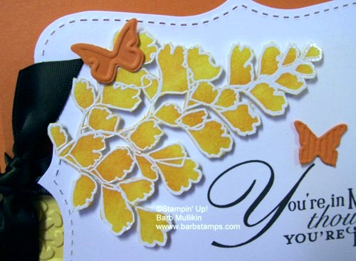 Growing Green is another set on the Retiring Stamp Set List. For this card, I stamped the large leafy image in Versamark on Whisper White and heat embossed with White Embossing Powder. I then used Sponge Daubers (Get your Sponge Dauber Case HERE) to add Daffodil Delight and Peach Parfait to the leaves. I was a bit messy but since I was cutting it out, I didn't need to be neat.