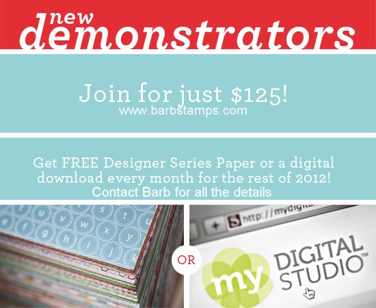 **Join my team during Sale-a-bration for only $125 and you will receive a FREE pack of Designer Series Paper ($10.95 value) or My Digital Studio downloads each month you are an active demo and place an order through December 2012!!