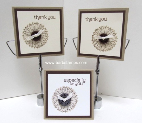 My layers are 3 x 6, 2 3/4 x 2 3/4 and 2 1/2 x 2 1/2.  The bold image is stamped in Crumb Cake and the detail stamp is done with Chocolate Chip.  The Neutrals Designer Button on the bottom card has been stamped with White StazOn and then a small knot of 1/8″ Taffeta Ribbon was added to the middle with a Mini Glue Dot.