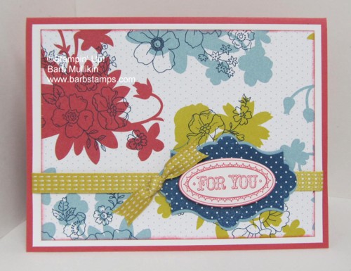 I also used the new Summer Starfruit Ribbon along with the Primrose Petals card stock and Midnight Muse Ink.  The beautiful Designer Series Paper is from a new package called Patio Party.