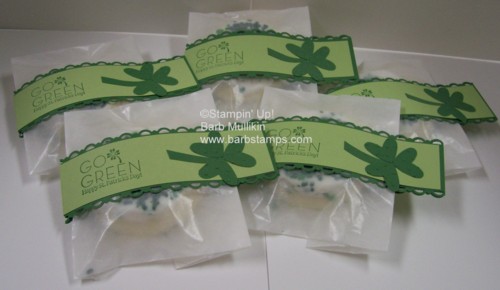I whipped up a pile of these cookie treats for some friends. I used the Glassine Bags and Go Green single stamp from the Occasions Mini Catalog.  For those of you who are wondering, I did not bake these cookies, they are the Lofthouse brand. 🙂