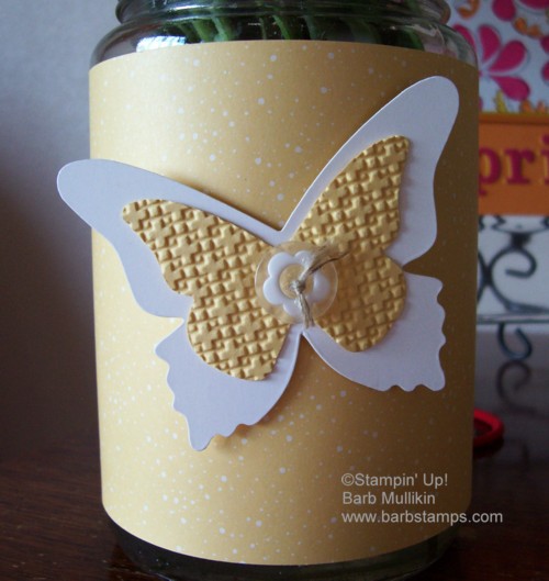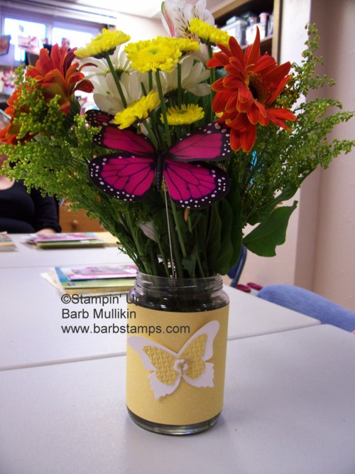 Flowers I had to confess that I did not have a vase and she mentioned using a Mason Jar. I thought surely I had a Mason Jar and went to look.  All I could find was an emply pickle jar that I have saved for the kids in case we find a really cool bug, frog, turtle, etc.  I grabbed the pickle jar and added the flowers.  It just didn't look right, a beautiful bouquet of flowers in a pickle jar with a label on it.  I had about 5 minutes before the rest of the guests arrived so I scurried around in my studio and this is what I came up with.  I used a piece of Designer Series Paper from the Flock Together pack, the Beautiful Butterflies Big Shot Die, the Square Lattice Impressions Folder and a button from the Button Latte set.  The wrap slips on and off so I can change it.  I was literally done in under 5 minutes.  I am thrilled with it!!  Now I have a "vase" and I can customize it to my liking!!